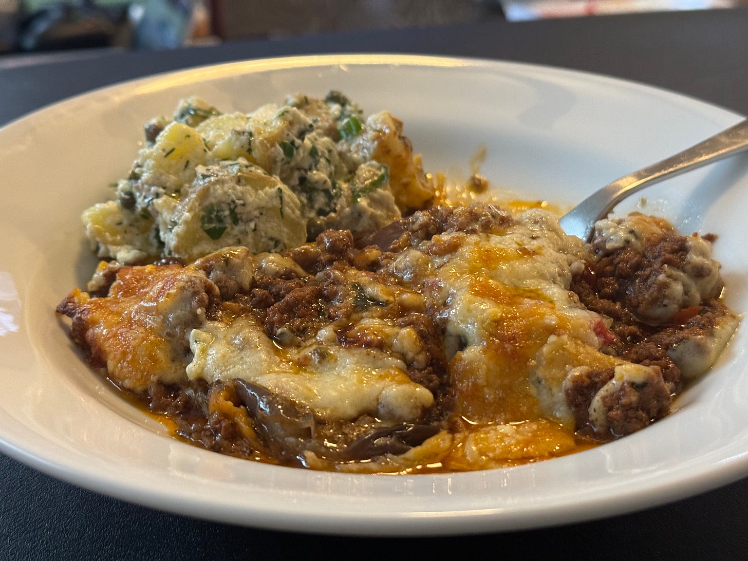 One of my favorites was Moussaka and Potato Salad. The Moussaka is a casserole with a layer of eggplant, topped with a layer of meat sauce, and finally topped with a layer of béchamel. The individual layers are cooked, then combined and baked in the oven to let it all come together. I served it with a potato salad that was dressed with fresh dill, lemon juice, and yogurt. Sadly, the dressing for my potato salad broke, but thankfully it didn’t affect the taste. While I do like dill, I felt like it was a bit much. Maybe I just used too much. On the other hand, the moussaka was so rich and savory that the fresh dill and yogurt served as a foil against it all being too rich to finish. This was an interesting dinner in that the moussaka was too loose, so neither dish looked particularly amazing, but the flavors were on point.