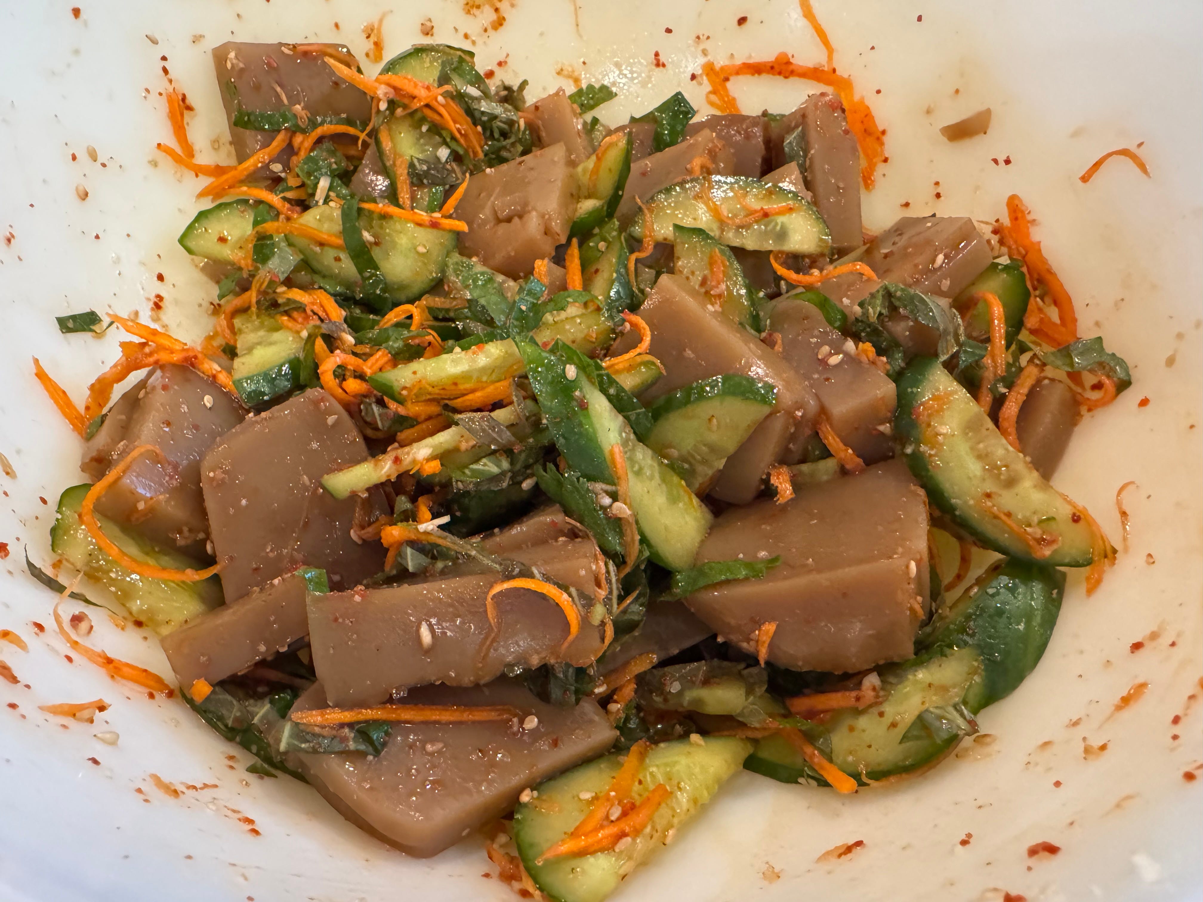 The last Korean dish for the week was Dotorimuk Muchim (UMMA, pg 62). This is a salad whose base is acorn jelly. The recipe calls for making your own jelly, but I will admit to cheating and buying it from the market. One of the benefits of having a mostly Korean grocery store near you is having access to fresh deli ingredients like this. The texture is somewhere between a custard and boba — very refreshing, with a slightly nutty taste — but I believe it is primarily about the texture. The flavors of this dish were dominated, in a good way, by the interplay of the plum syrup and the spicy, herby flavor of the sesame leaves.