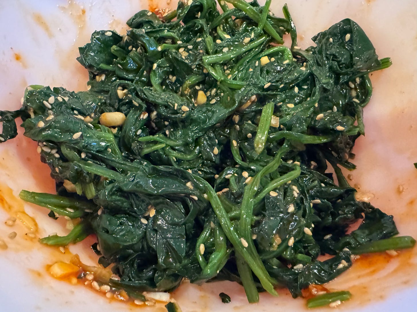 Seasoned Spinach with Gochujang (UMMA, pg 54). This dish was SO GOOD, especially with white rice. Besides the tofu, I found myself coming back to this dish over and over throughout the week. Both this and the next dish use an ingredient that was new to me: Korean plum syrup. If you find a Korean recipe that calls for this and they give you a substitution, just go find the real thing before you make the dish. The tartness and sweetness it adds has a flavor that is unique and familiar at the same time. It makes the dish.