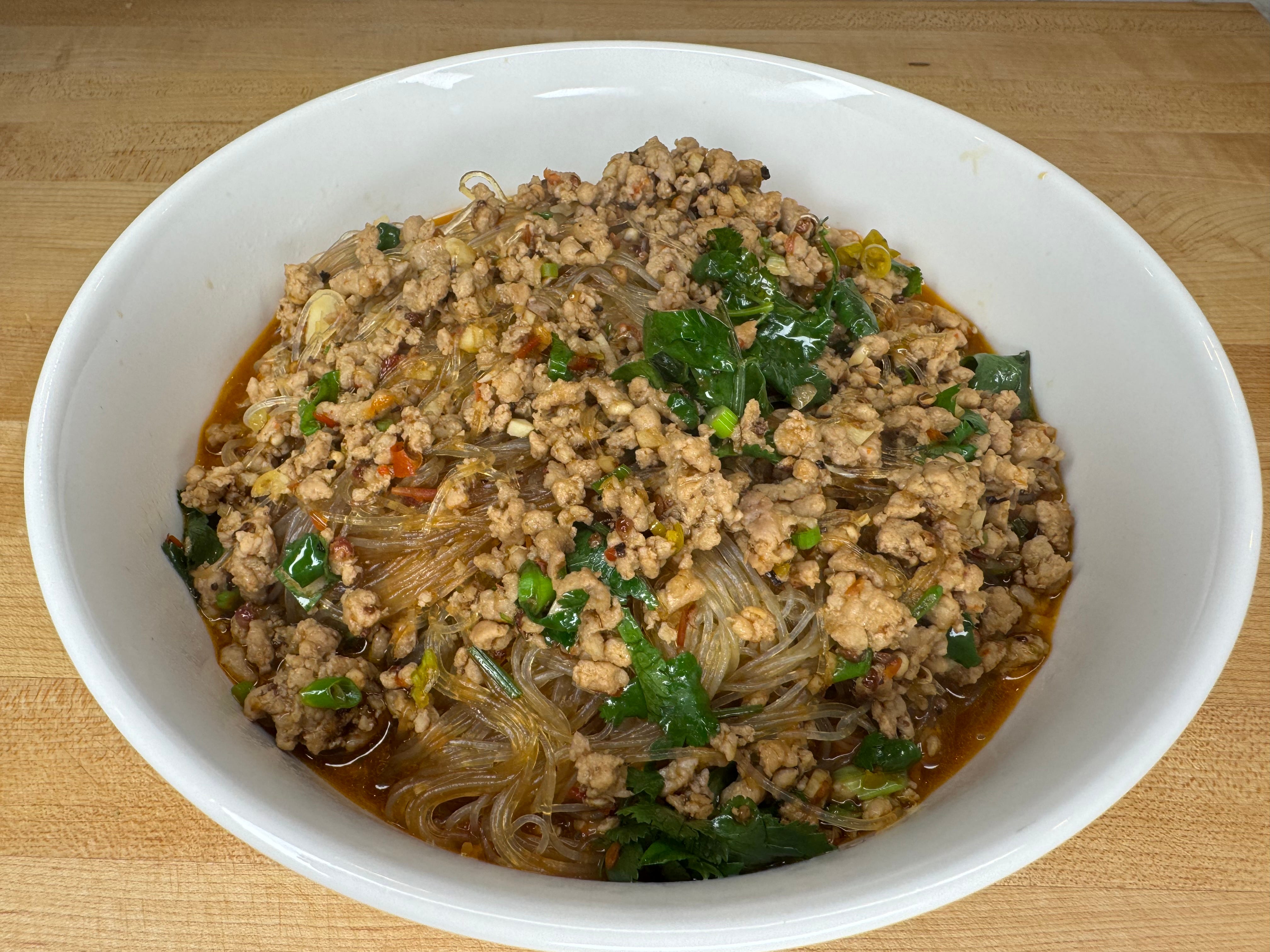 The last dish I made this week was one I’ve made before: Ants Climbing Trees (The Wok, pg 382). This dish is named for the way the bits of ground pork cling to the noodles. I tend to push things on the protein side, so admittedly this has more pork than the recipe calls for. One of my favorite flavor profiles is mala, the hot numbing flavor so unique to the Sichuan province of China. This is a cravable dish. I will say that I made a bit of a mistake this time and didn’t quite drain the noodles enough before adding them to the pork and sauce, so the sauce ended up a little thin.